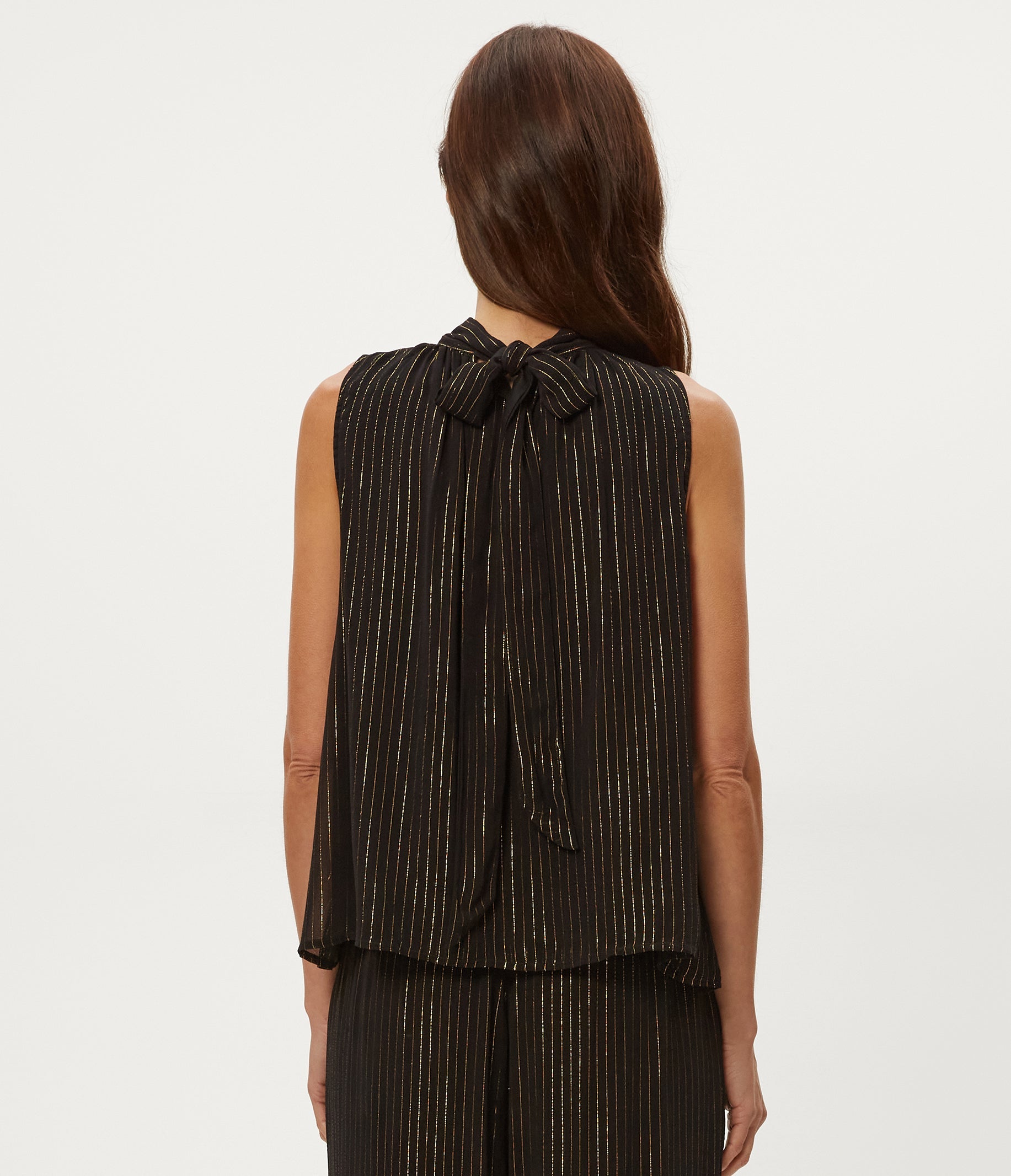 Party-ready and polished. Alicia features a soft tie neckline, sleeveless design, and a relaxed drape that moves beautifully. Metallic stripe chiffon gives it a touch of shimmer, making it an easy match for tailored pants, skirts, or denim when you want a little festive shine.