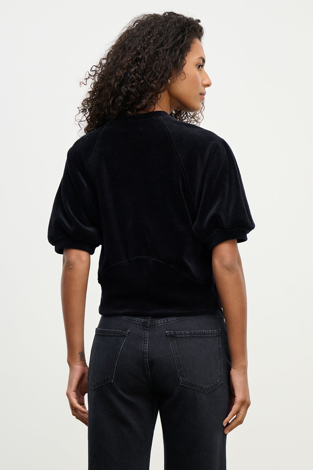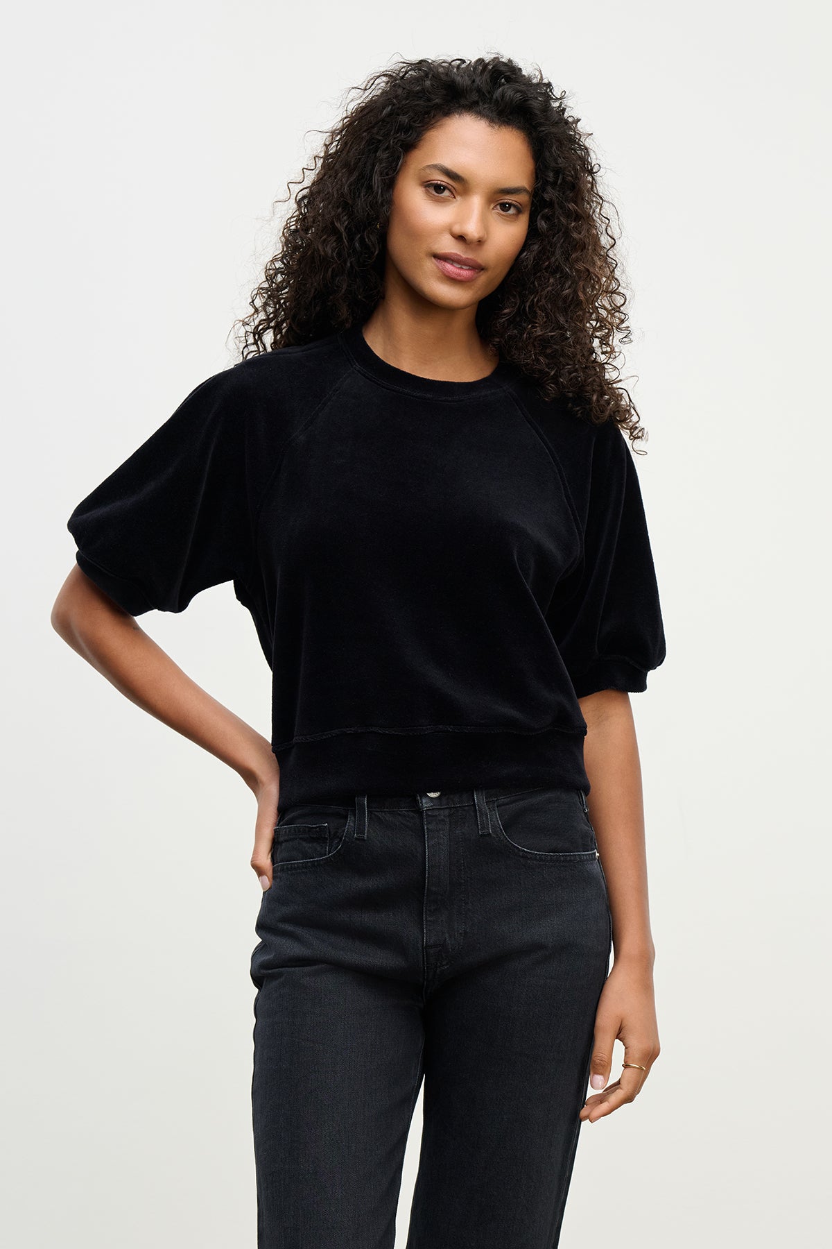 An elevated take on casual comfort. The Avis Top is crafted from soft cotton velour, giving it a subtle sheen and luxe feel. Designed with short raglan sleeves, a relaxed fit, and a banded hem, it’s the perfect mix of laid-back and polished.