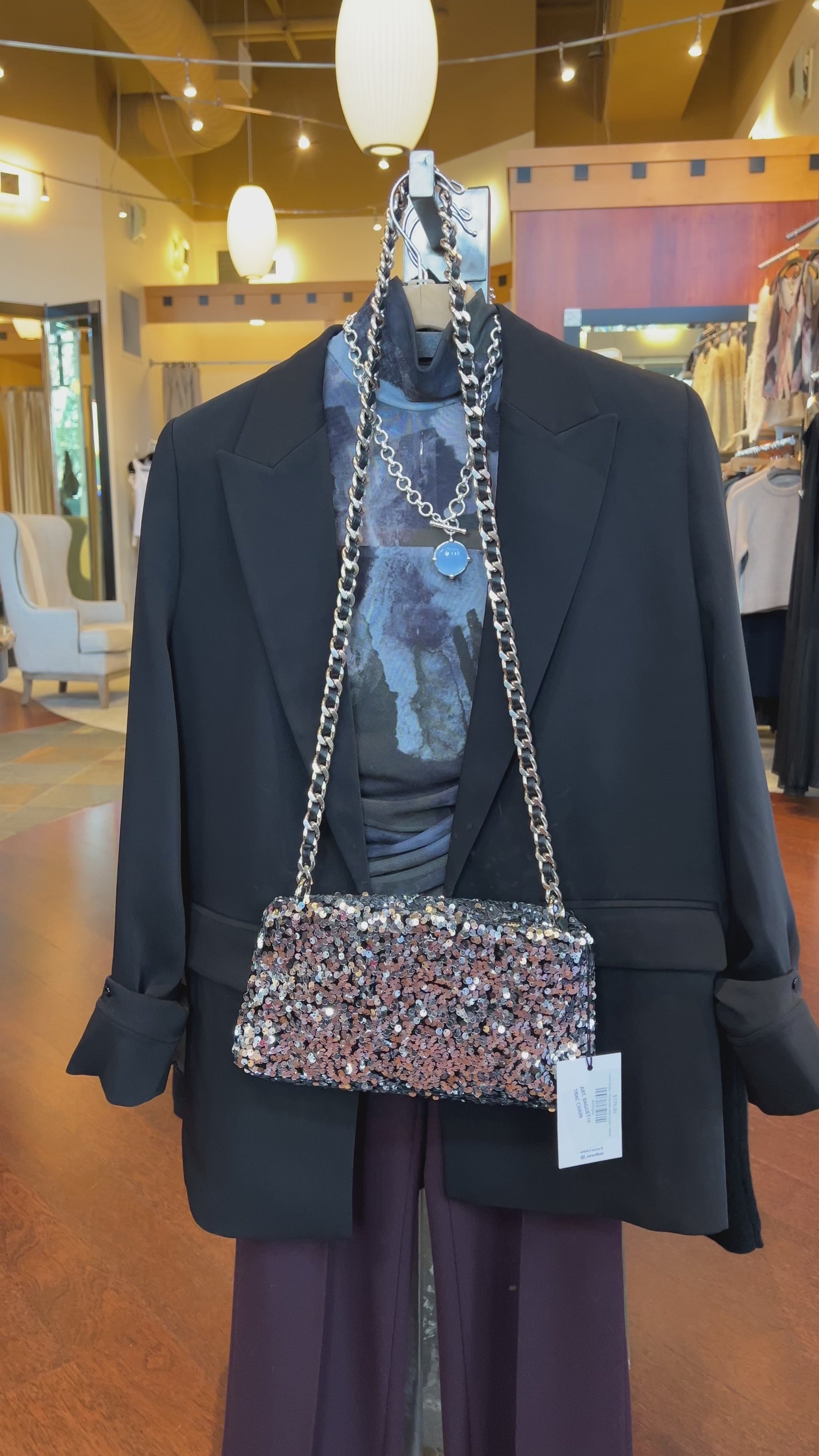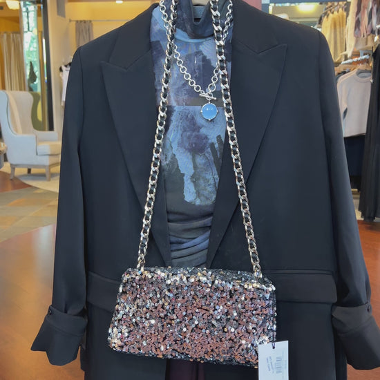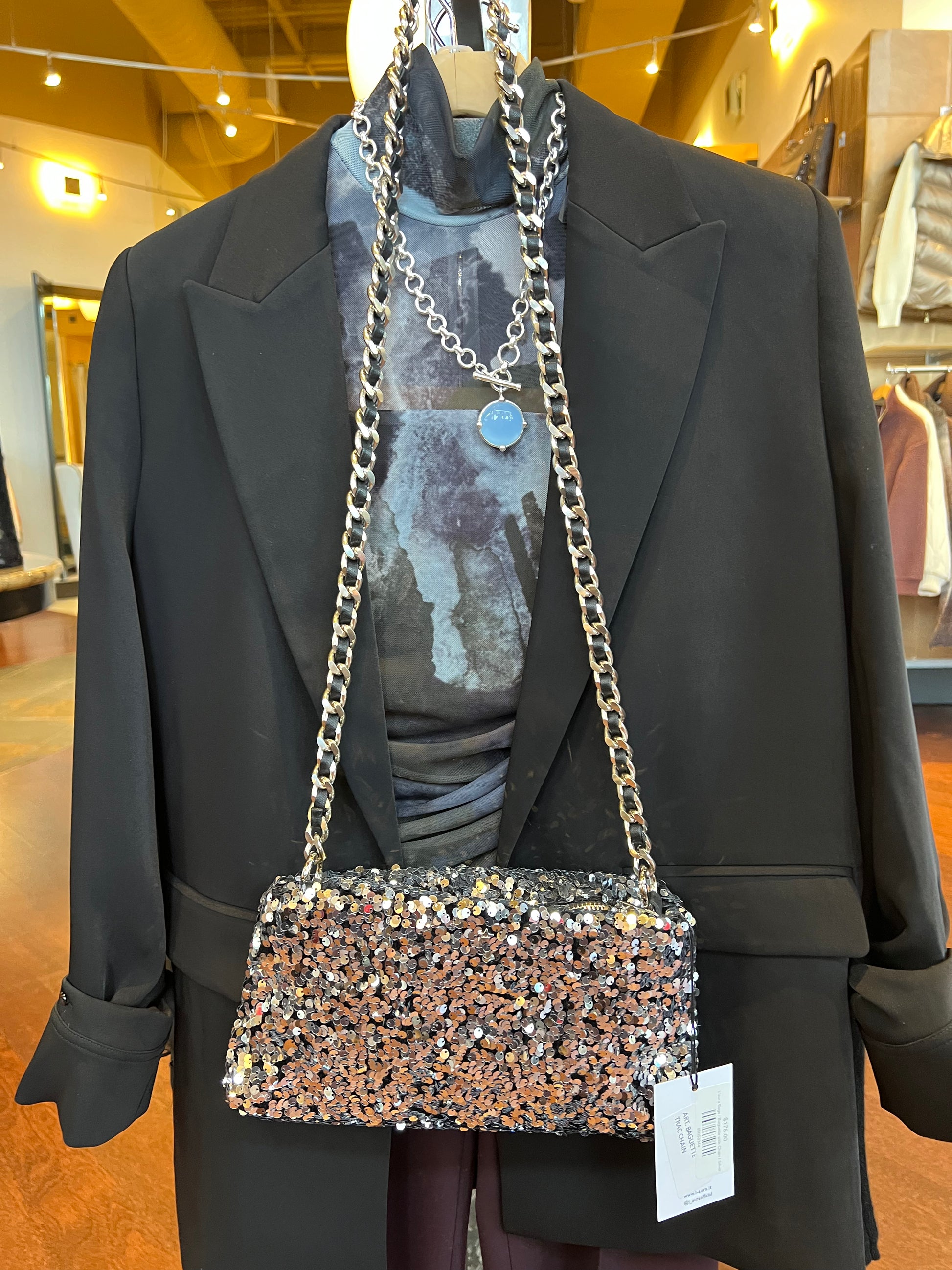 A little sparkle goes a long way. This embellished baguette bag adds instant glam to any outfit with its structured shape and eye-catching shine. Finished with a statement chain strap, it’s the perfect piece for holiday parties, nights out, or adding something fun to your everyday look.