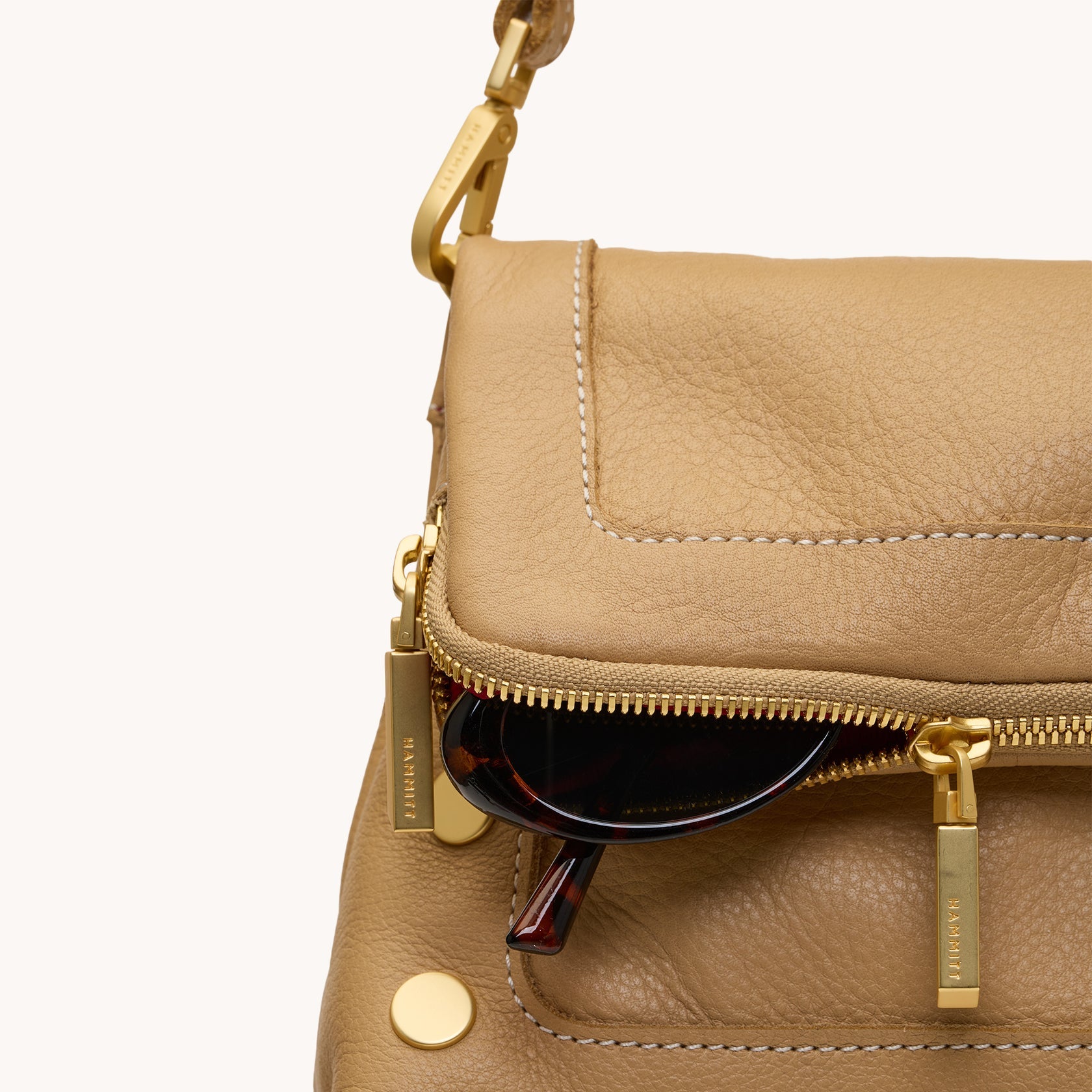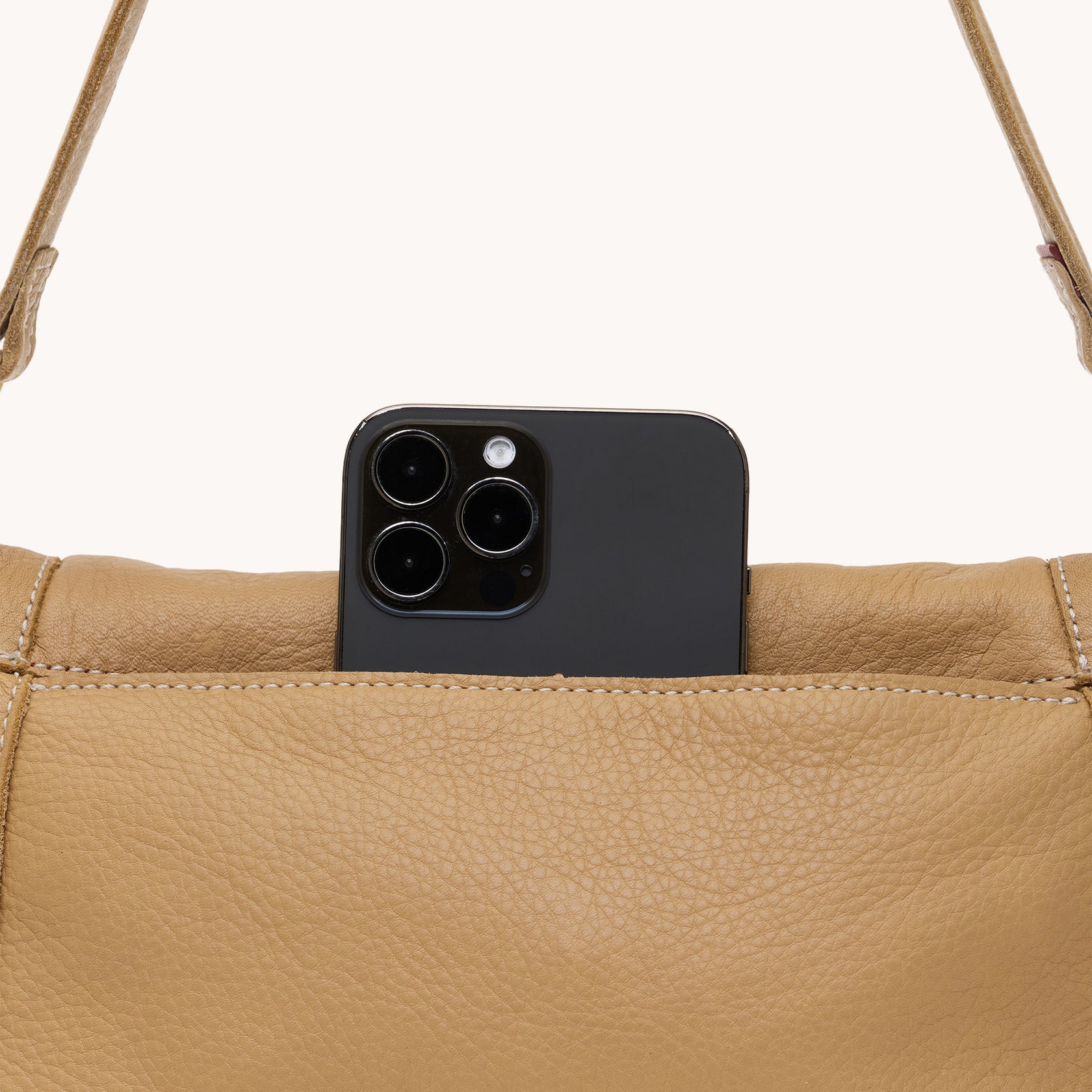 Crafted in pale tan pebbled leather, this modern neutral adds warmth while keeping the look clean and timeless.