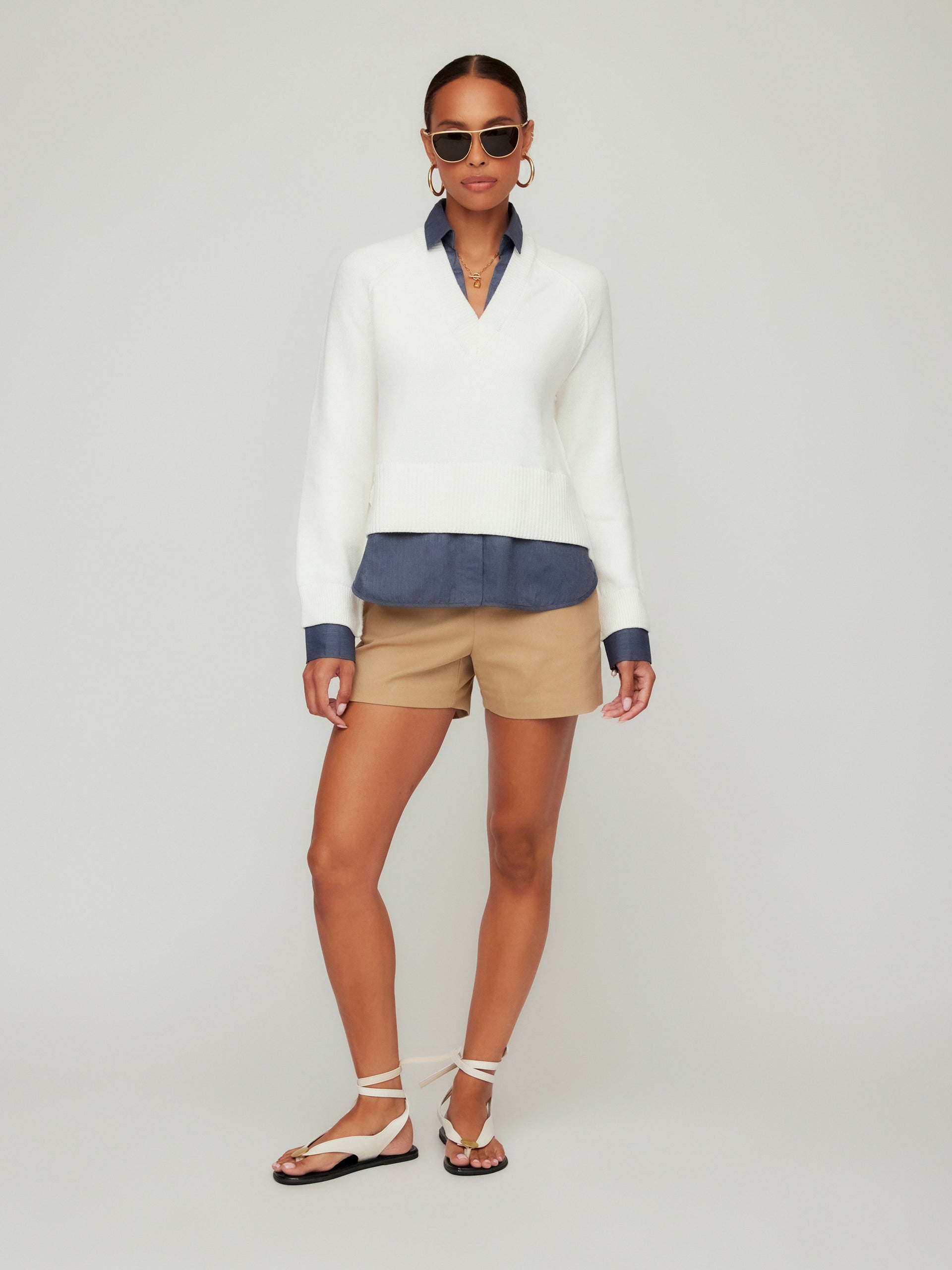 The Carrie Mixed Media Sweater gives you the look of perfectly layered styling in one effortless piece. Designed with a soft knit body and woven faux layer details at the collar and hem, it creates the appearance of a crisp shirt under a cozy V neck sweater without added bulk.
