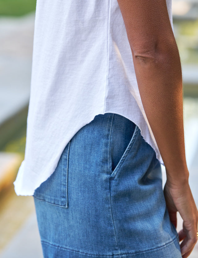 Hand-cut curved raw hem that provides coverage over the bum