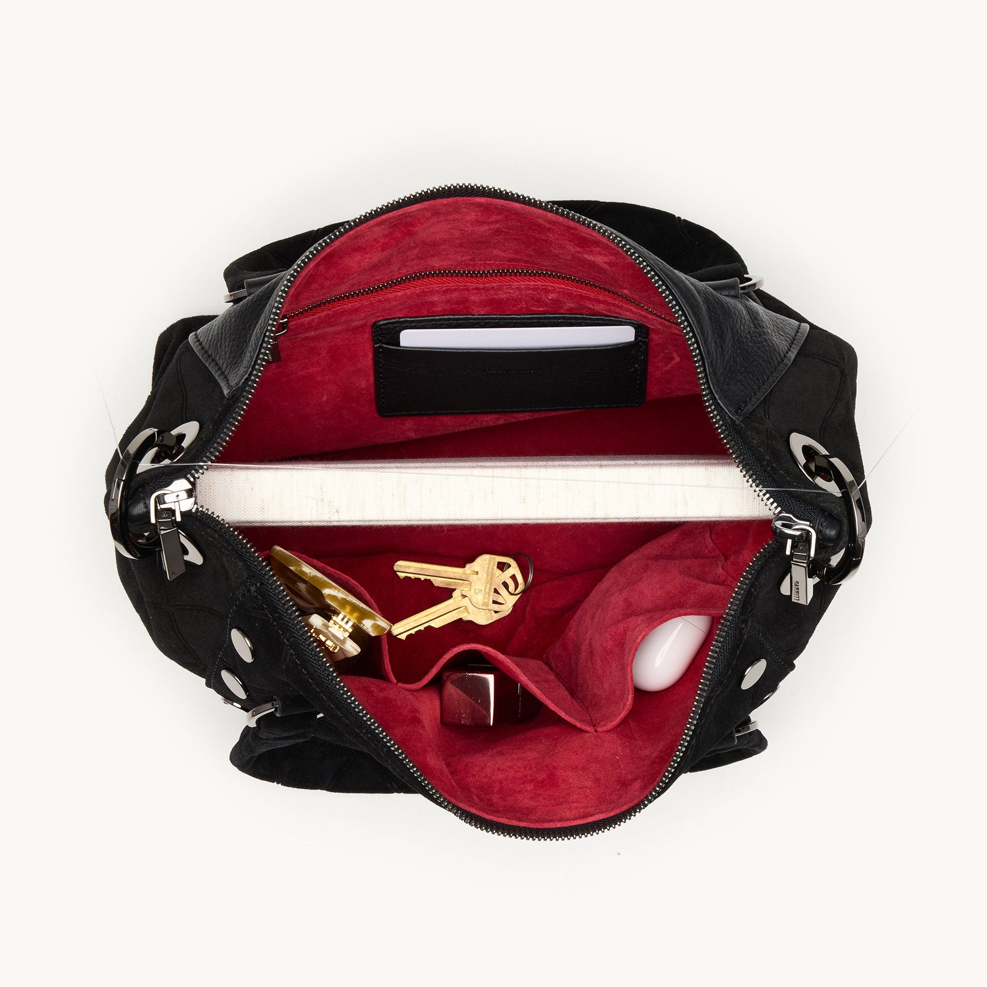The suede is naturally water-resistant, but store in its dust bag when not in use. Avoid oils, lotions, and sunscreen.