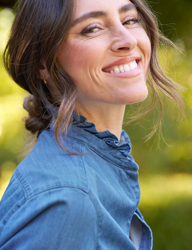 This best-selling button-up has been updated with a beautifully feminine ruffled collar, adding a chic twist to a classic favorite. Designed for a relaxed fit, this shirt is just as flattering and easy to wear as ever, thanks to our signature button placement.
