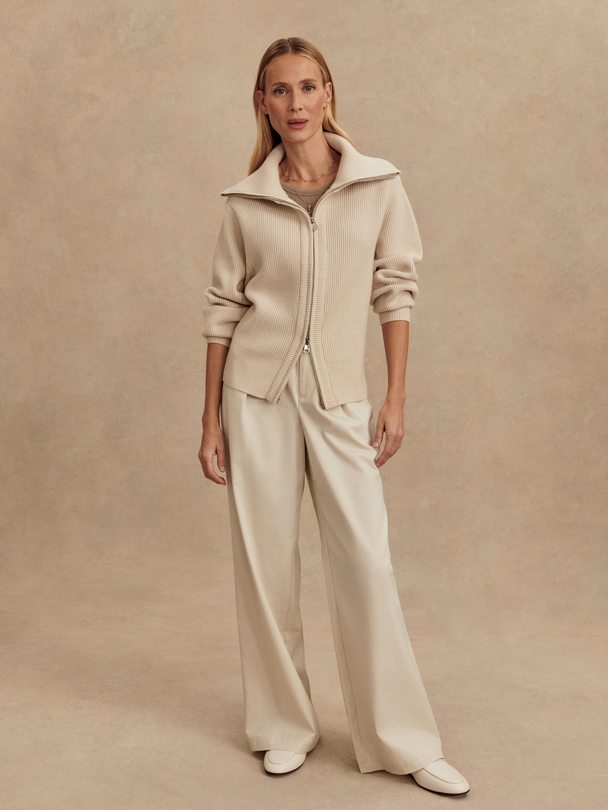 A soft knit jacket designed for layering through cooler days. Crafted in mid-gauge Soft Viscose yarn with an all-over rib stitch, the Enrico has a substantial feel while staying comfortable and easy to wear. Finished with a fold-back collar, double-ended zip, and refined trims along the armholes.