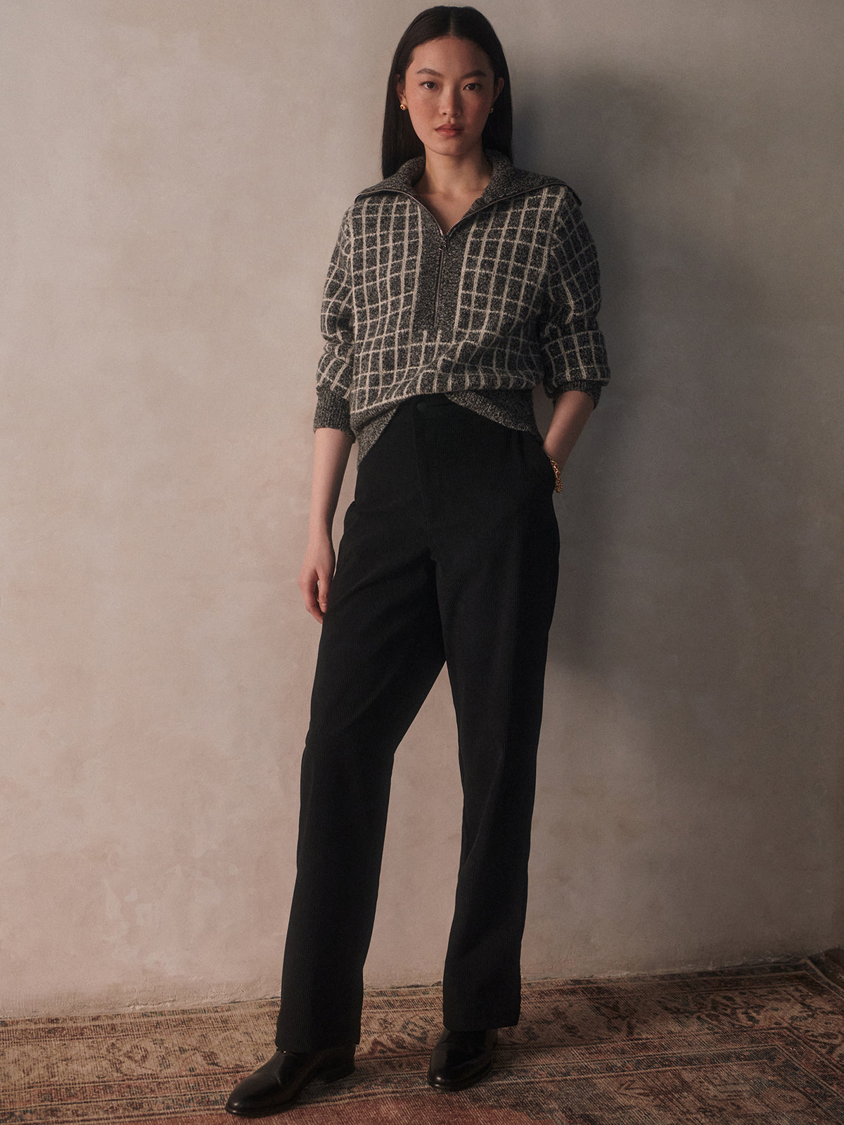 The Furley brings texture and polish to your everyday lineup. Designed in a plush bouclé jacquard with a checkered pattern, this half-zip knit features a relaxed fit and turn-back collar for a modern take on cozy layering. Soft, warm, and easy to throw on — it’s the piece you’ll keep reaching for all season.