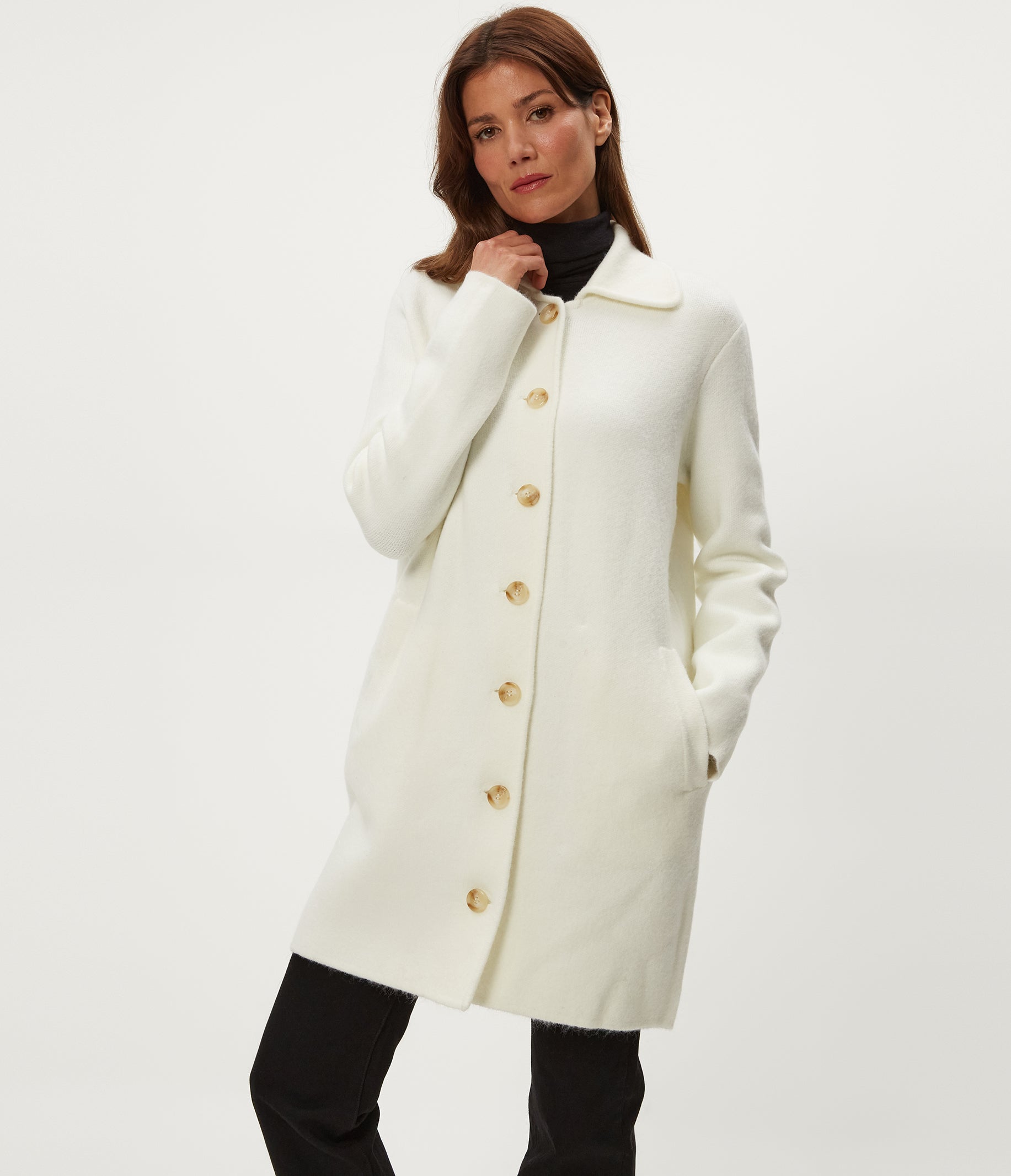 A cozy layer with a coat-inspired feel. The Glacia has a soft knit texture, a relaxed mid-length fit, a collar, front buttons, and pockets for everyday wear. It bridges the space between a sweater and outerwear, making it an easy piece to throw on over tees, blouses, and basics throughout the season.