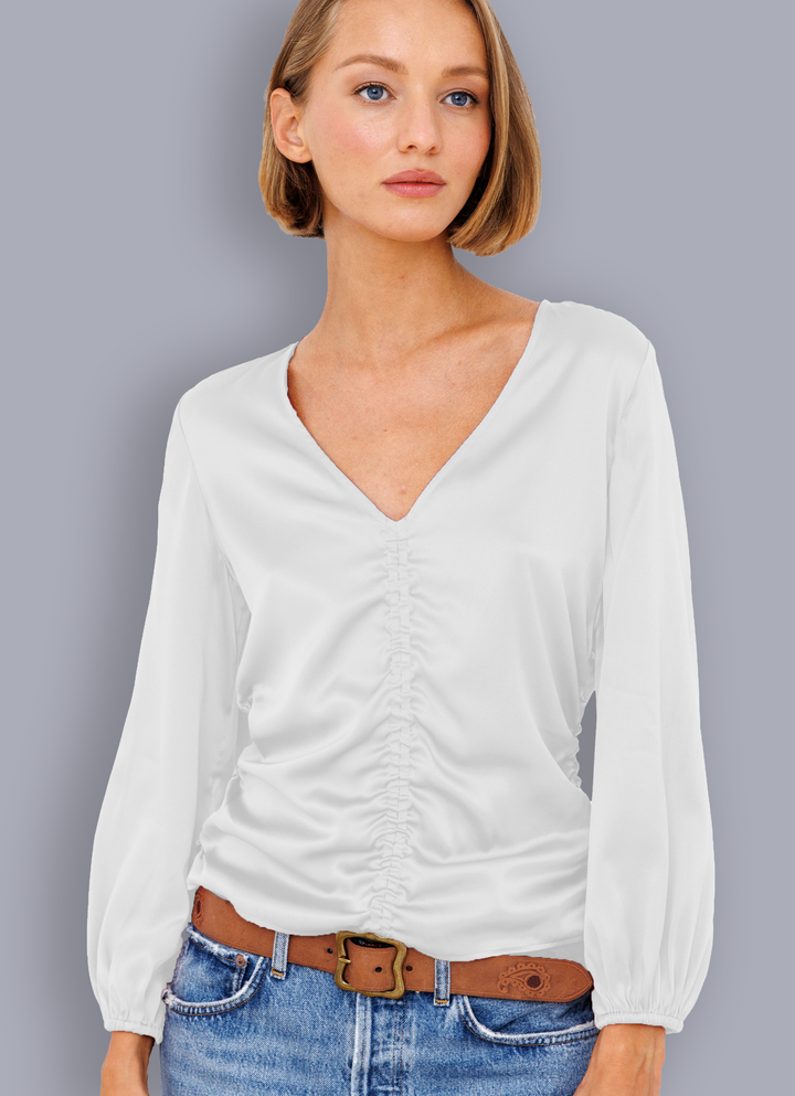 Elevate your wardrobe with the Go Scrunch Top in white, a perfect blend of chic elegance and sophistication. This classic top is designed to enhance any outfit, making it a must-have piece for your collection.