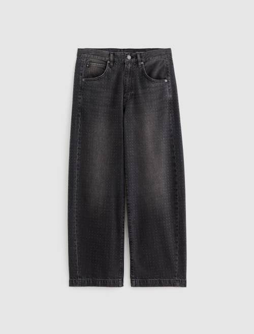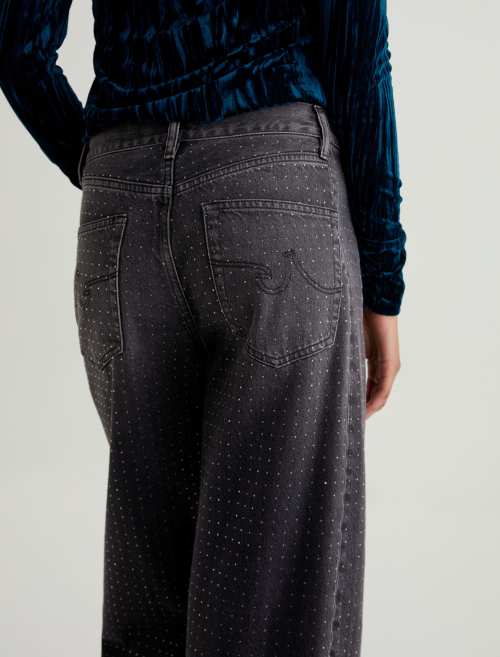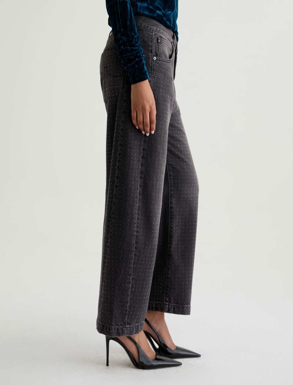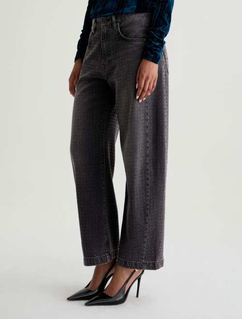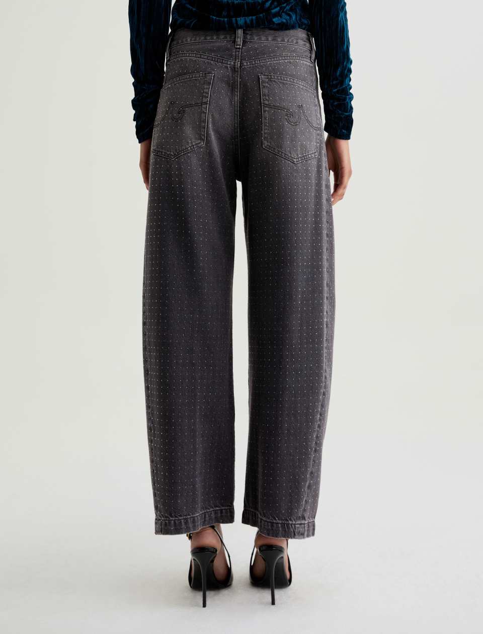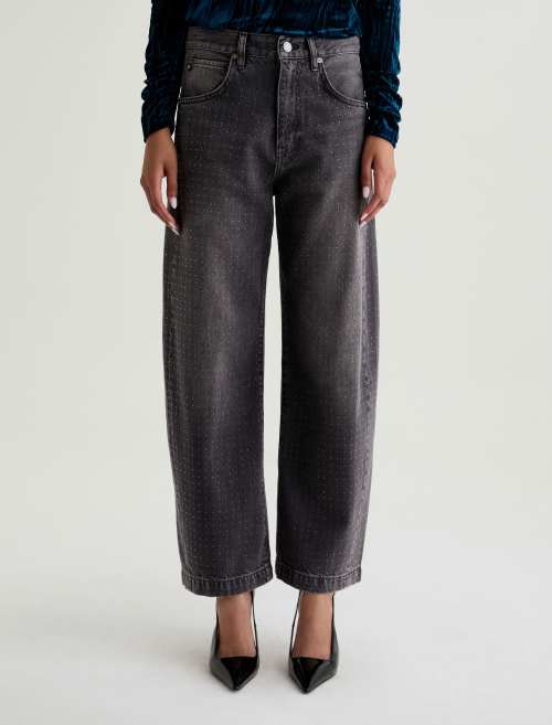 The Hattie Jean by AG is a statement-making barrel leg style with a high-rise fit and distinctive curved shape through the leg. Designed with side seam paneling and ankle-length proportions, this fashion-forward silhouette features an all-over clear rhinestone embellishment that adds just the right touch of glamour. Finished with classic five-pocket styling and crafted from premium non-stretch organic denim for authentic structure.
