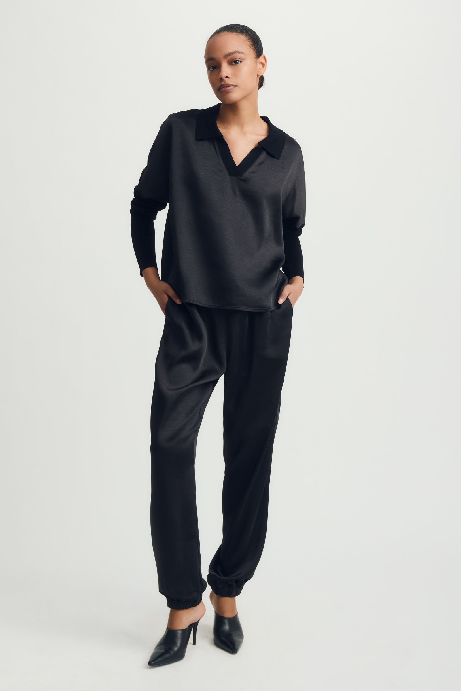 A satin jogger that feels polished while still giving comfort. The soft drape adds a dressy touch without being high-maintenance, and the elastic cuffs keep the fit relaxed but still neat. Pair it with sweaters, blouses, or the matching vegan-leather pieces for an easy outfit that works for dinners, events, and everyday wear. A simple way to look pulled together with minimal effort.