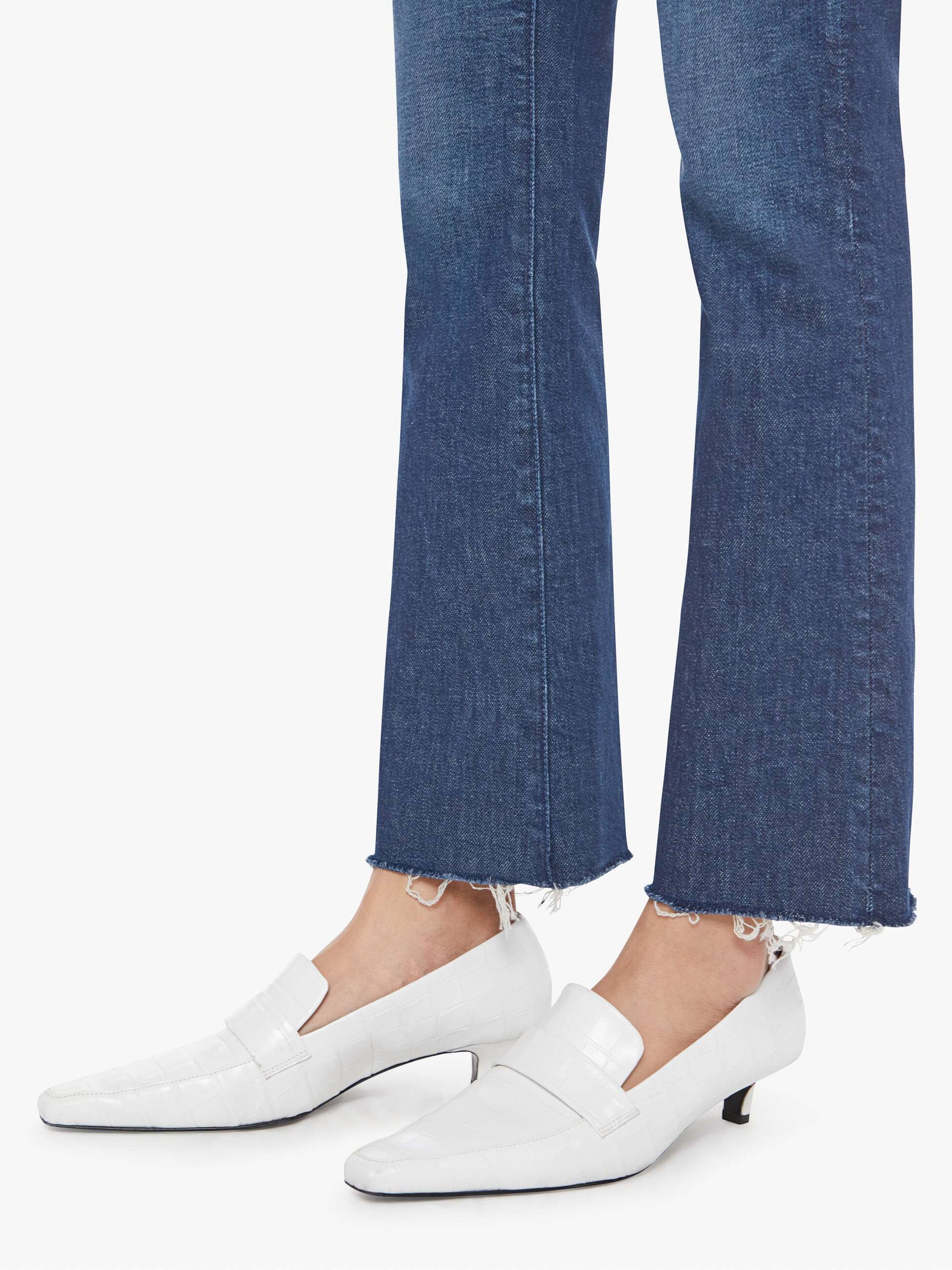 The Kicks And Riffs Jean by MOTHER is a high-rise flare designed to make a statement. Crafted from semi-rigid SUPERIOR denim, this dark blue wash features subtle fading, gentle whiskering, and a frayed hem for a lived-in look with edge. These jeans soften beautifully over time — MOTHER says patience is a virtue.