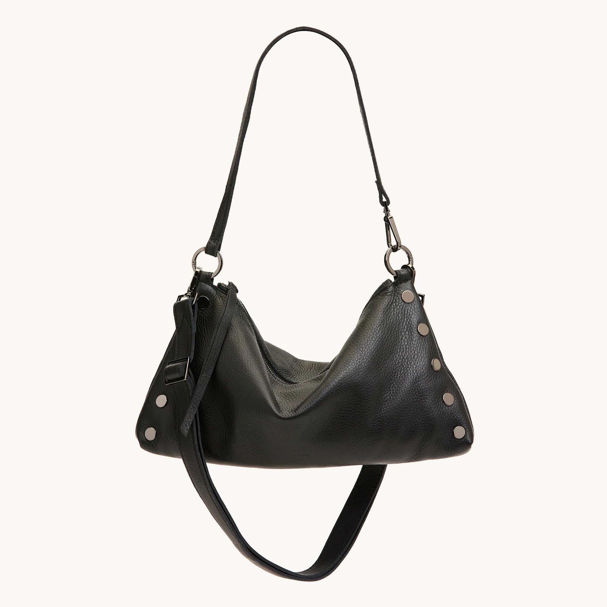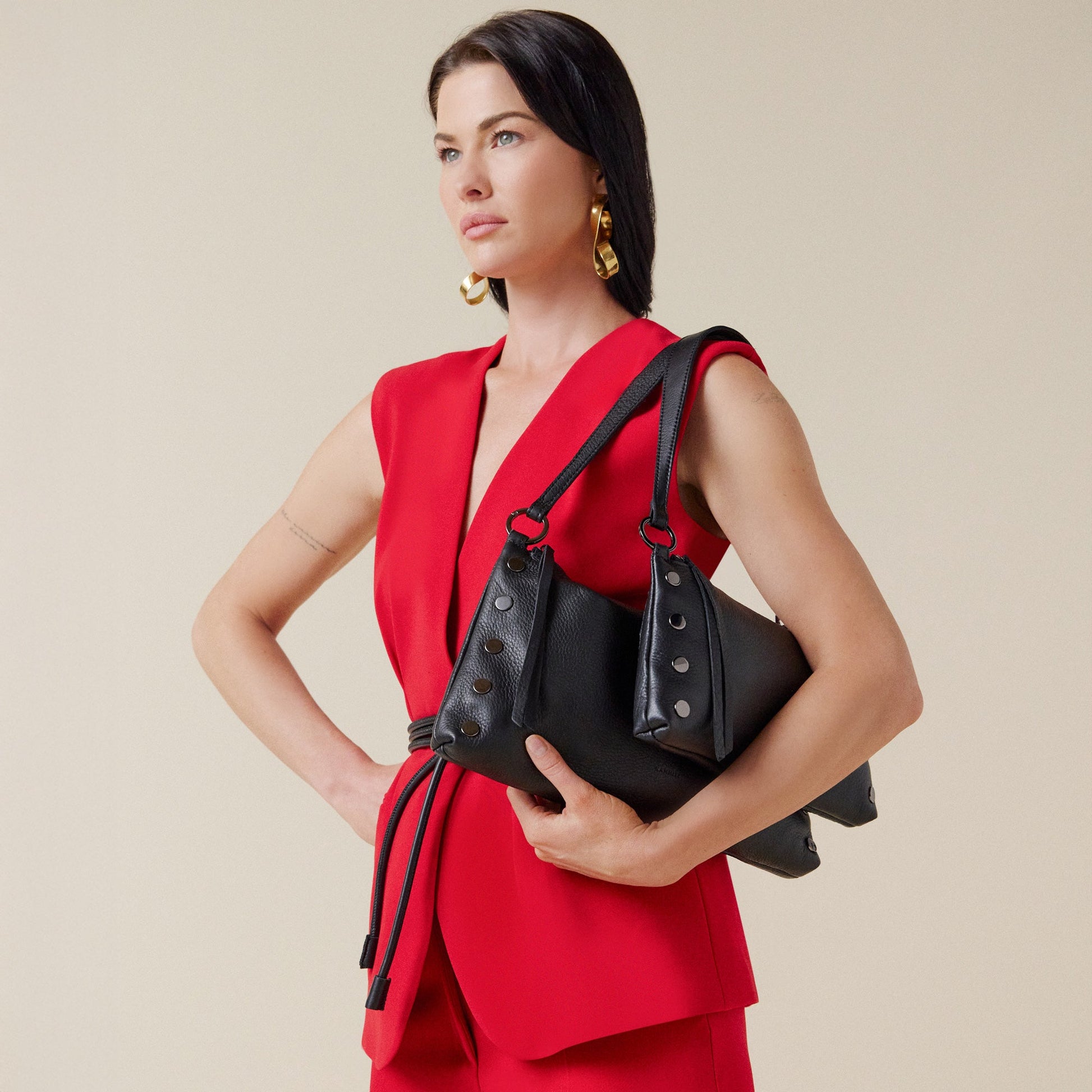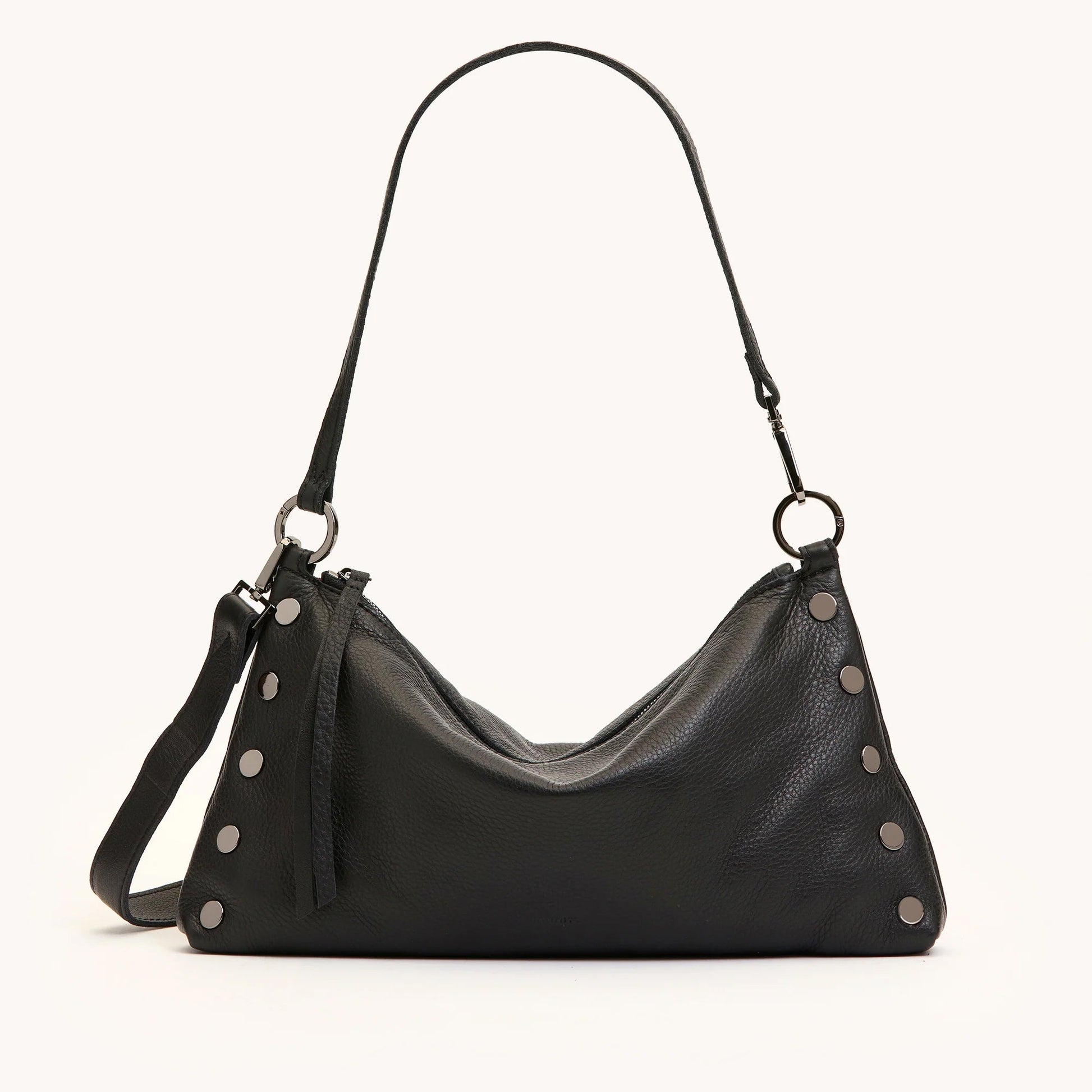 Crafted with classic black pebbled leather and finished with gunmetal hardware, this style blends everyday ease with Hammitt’s signature elevated details.