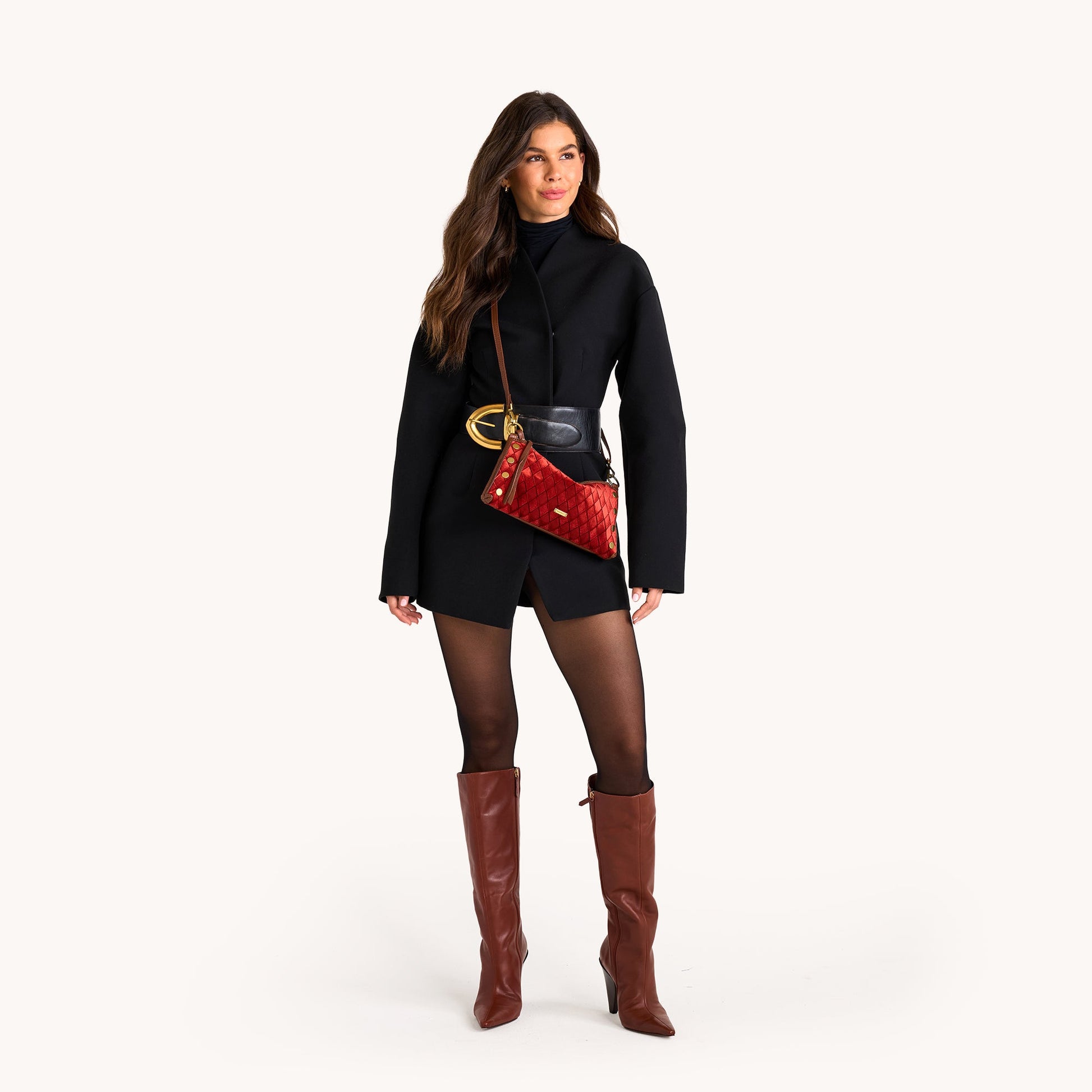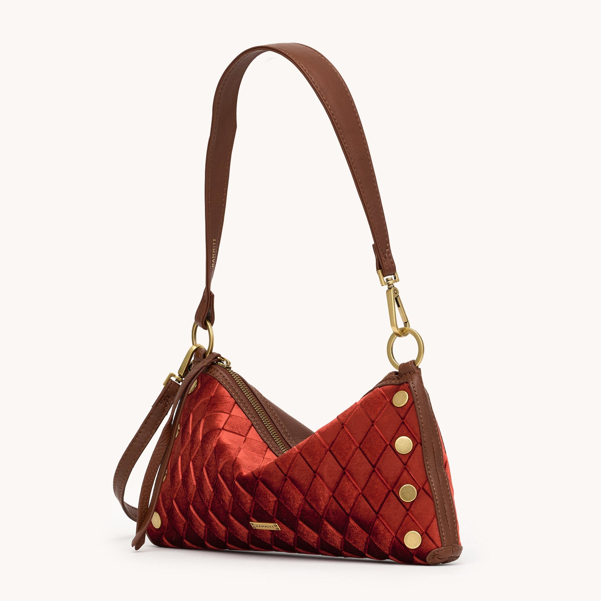 Crafted in deep, saturated toasted-orange Italian velvet with russet, umber, and sienna tones, this special edition brings warm dimension and rich texture. Deep brown pebble leather accents and antique gold hardware complete the look, along with Hammitt’s signature red cotton twill lining.