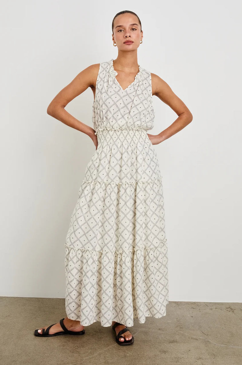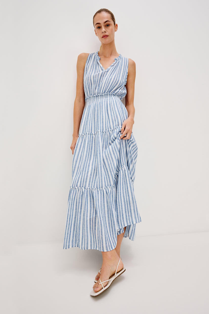 The Lou Lou is a luxe linen-blend dress designed to flatter with waist-cinching smocking. This maxi features a v-neckline and a fully-lined skirt with ruffle details at each tier, offering a breezy and feminine look that’s perfect for any occasion.