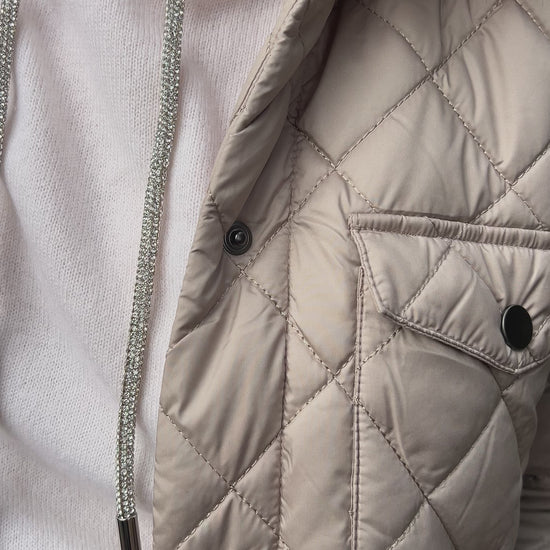 A classic cold-weather staple designed for layering. This quilted longline jacket features diamond quilting for a timeless look and lightweight warmth. The snap-front closure, flap chest pockets, and side-entry pockets keep it practical yet polished. Its neutral tone makes it easy to pair with everything from denim to tailored trousers.