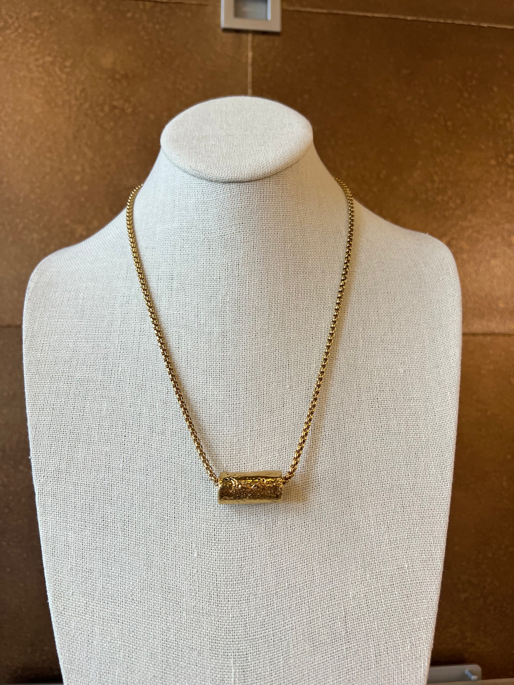 A streamlined statement piece featuring a textured rounded bar pendant suspended on a polished gold-plated chain. The minimalist silhouette and subtle surface detail make it an ideal everyday accent or a refined layering piece.
