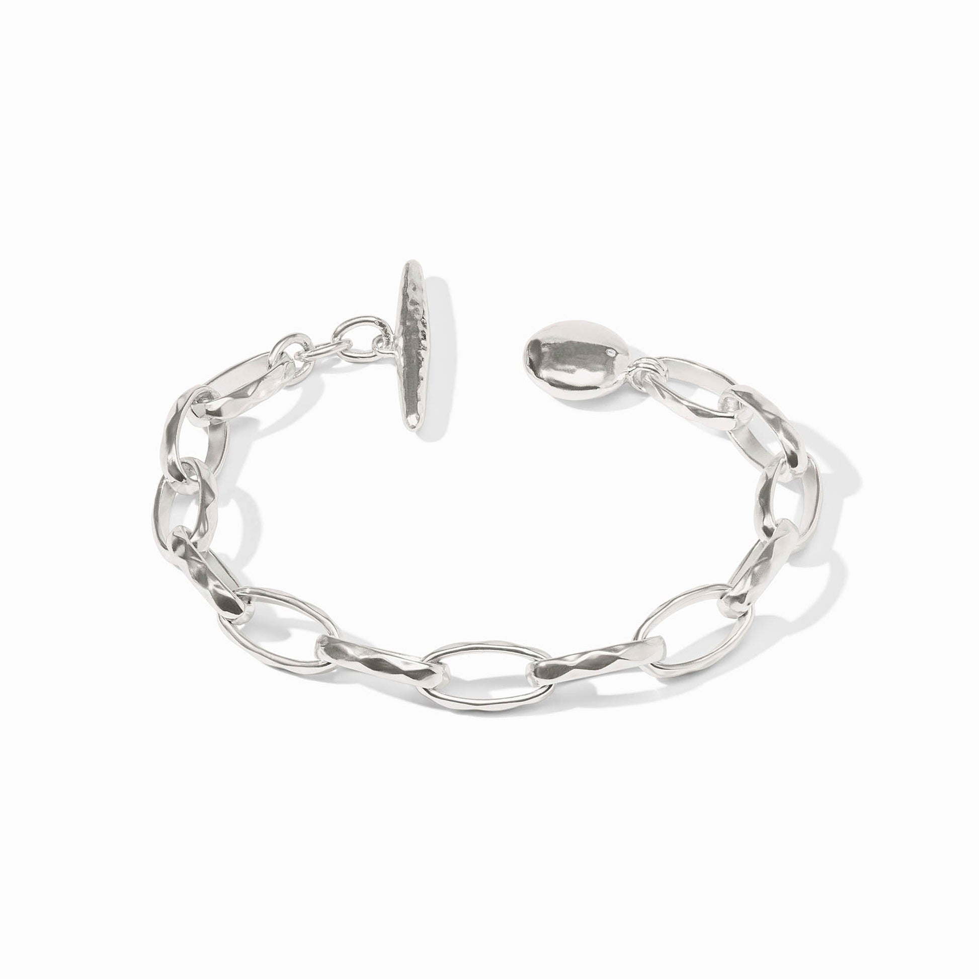 A chic and modern bracelet featuring a stunning chain link design that adds a touch of elegance to any outfit. Plated in pure silver and sealed to maintain its lustre, this bracelet showcases interlocking links that create a sophisticated look. With an adjustable inner circumference for a comfortable fit, it closes securely with a toggle, blending style with practicality.