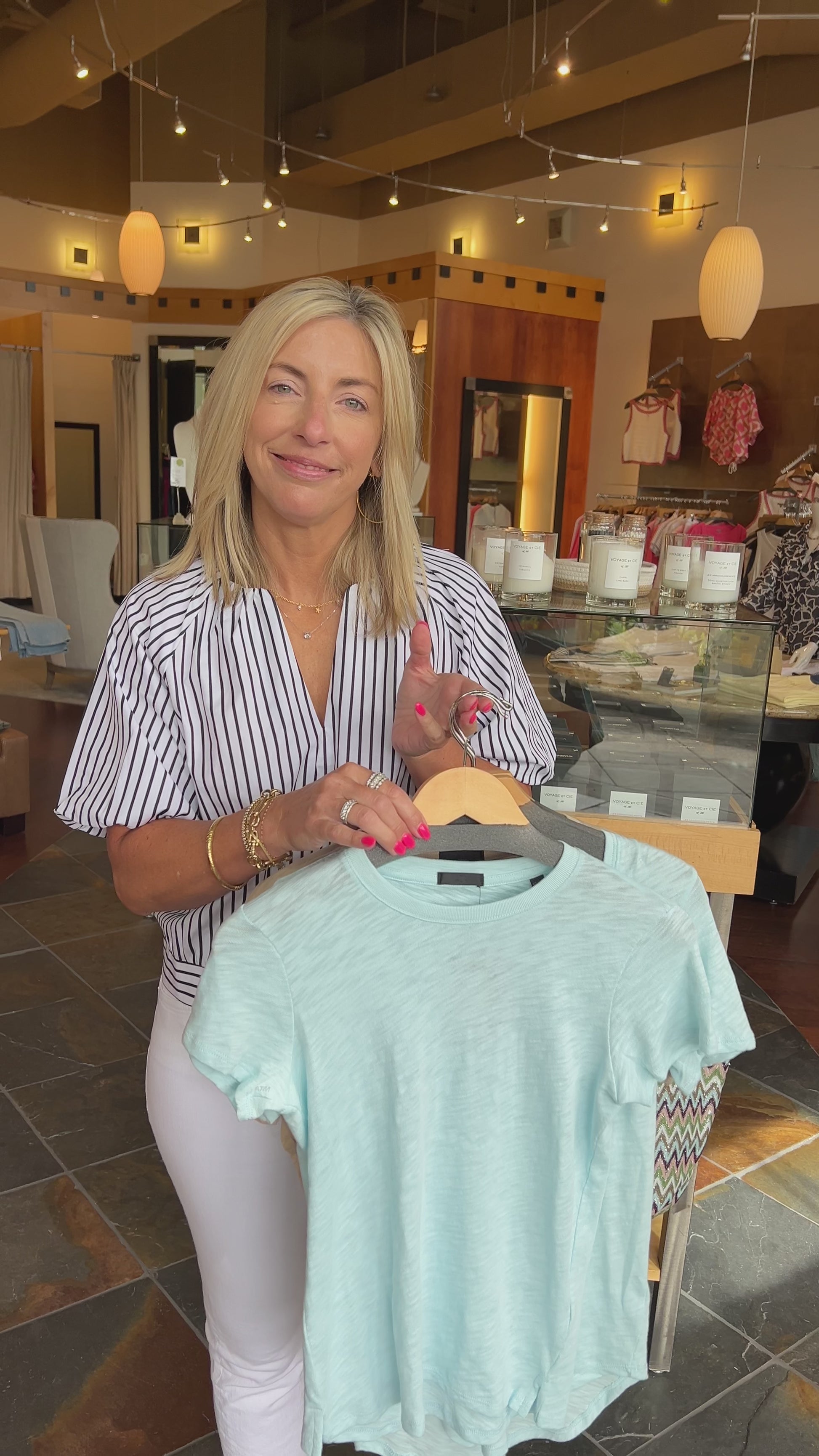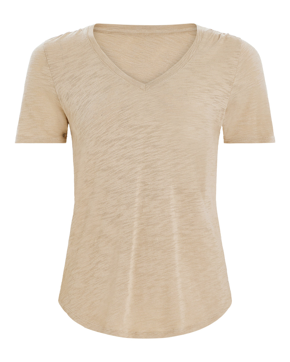 The Slub Jersey Classic Short Sleeve V-Neck Tee—best-selling style—now in the fresh seasonal shade of Dune. Loved for its lightweight feel, relaxed drape, and subtly sheer finish