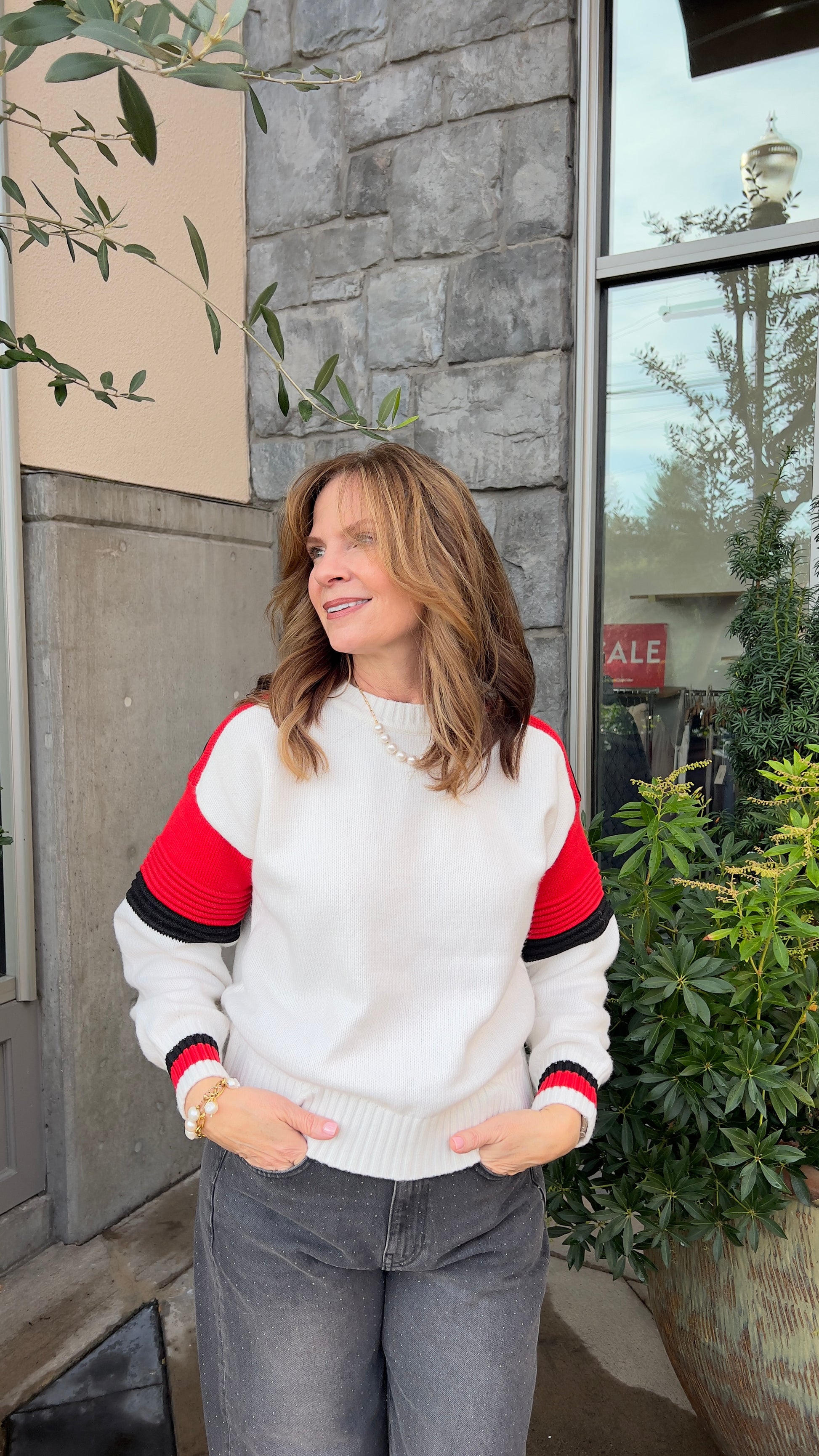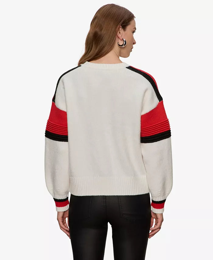 A casual essential with a sporty twist. This striped crewneck sweater features long sleeves with rib detailing and an easy pull-on fit, perfect for relaxed days and laid-back outings. Soft, comfortable, and effortless to style.
