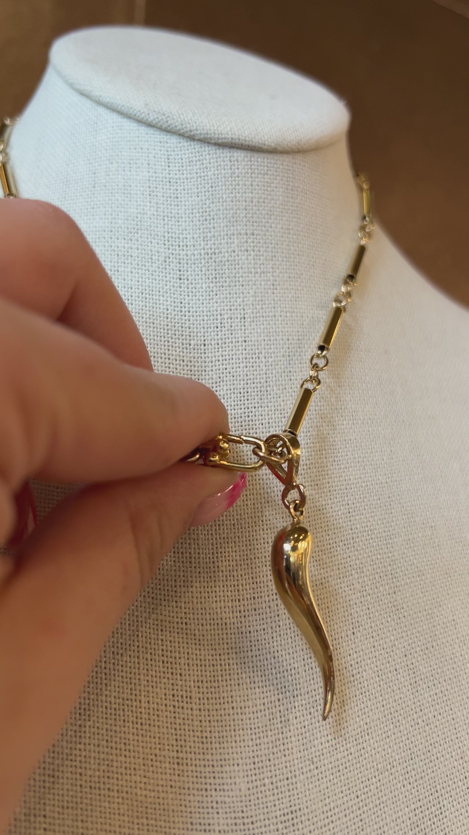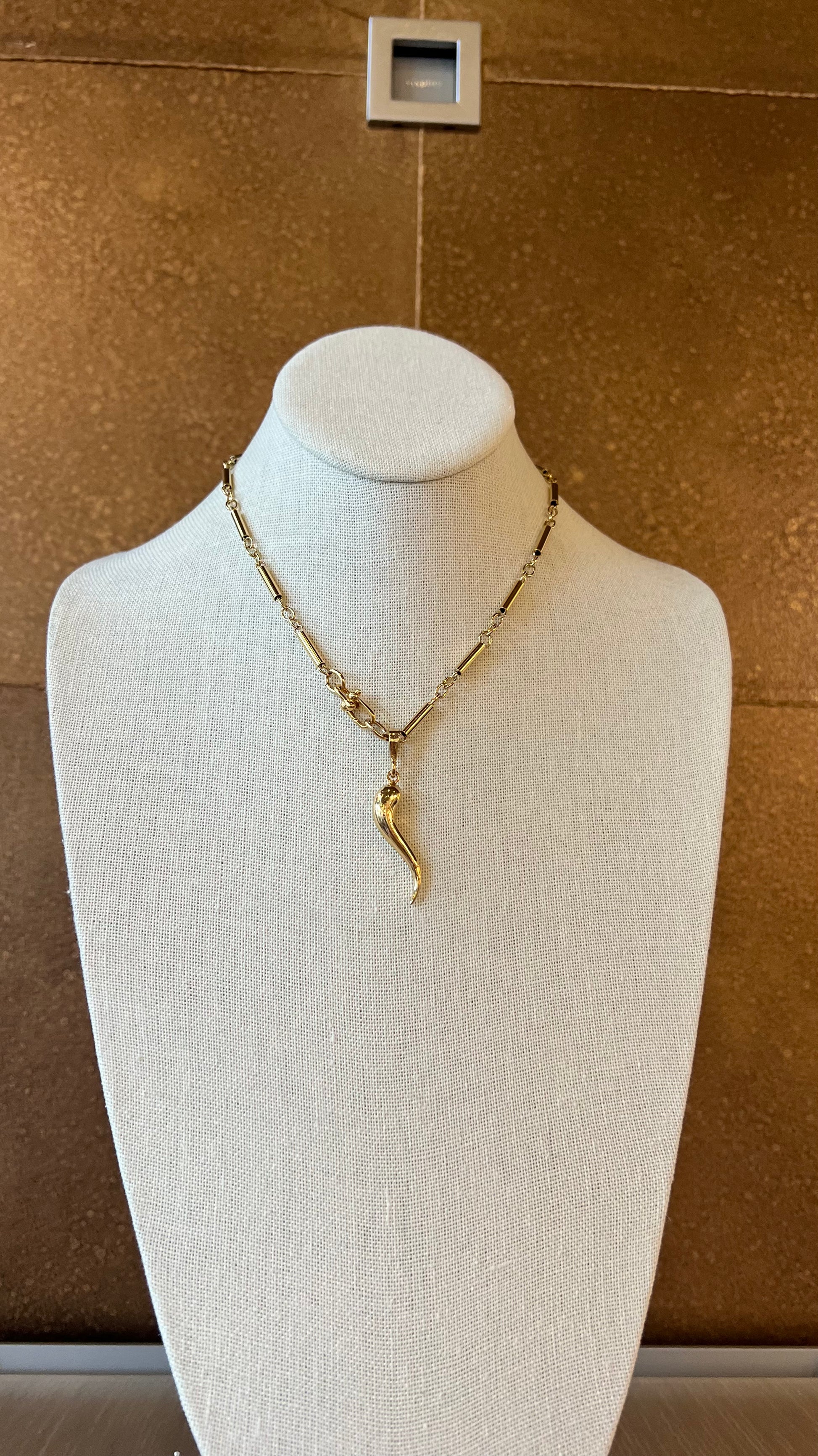 Introducing the Swoosh Pendant Necklace by Lisa Smith, a sleek blend of modern elegance and subtle edge. Crafted from gold-plated metal, the chain features alternating elongated and satellite-style links with crystal-accented spacers. The centerpiece swoosh pendant adds dynamic movement and a sculptural silhouette. Finished with a lobster-claw clasp, this necklace transitions effortlessly from daytime chic to evening glamour.