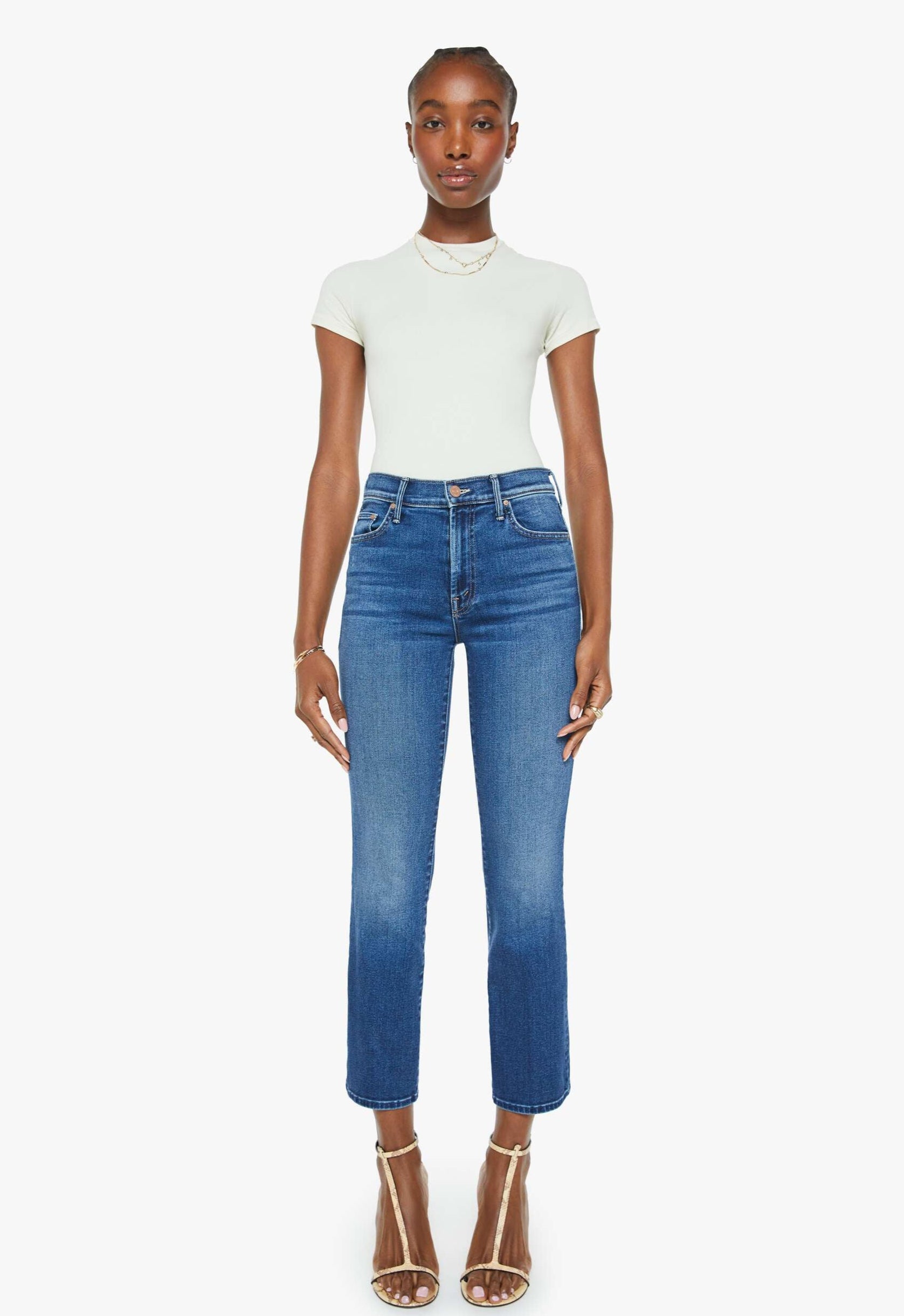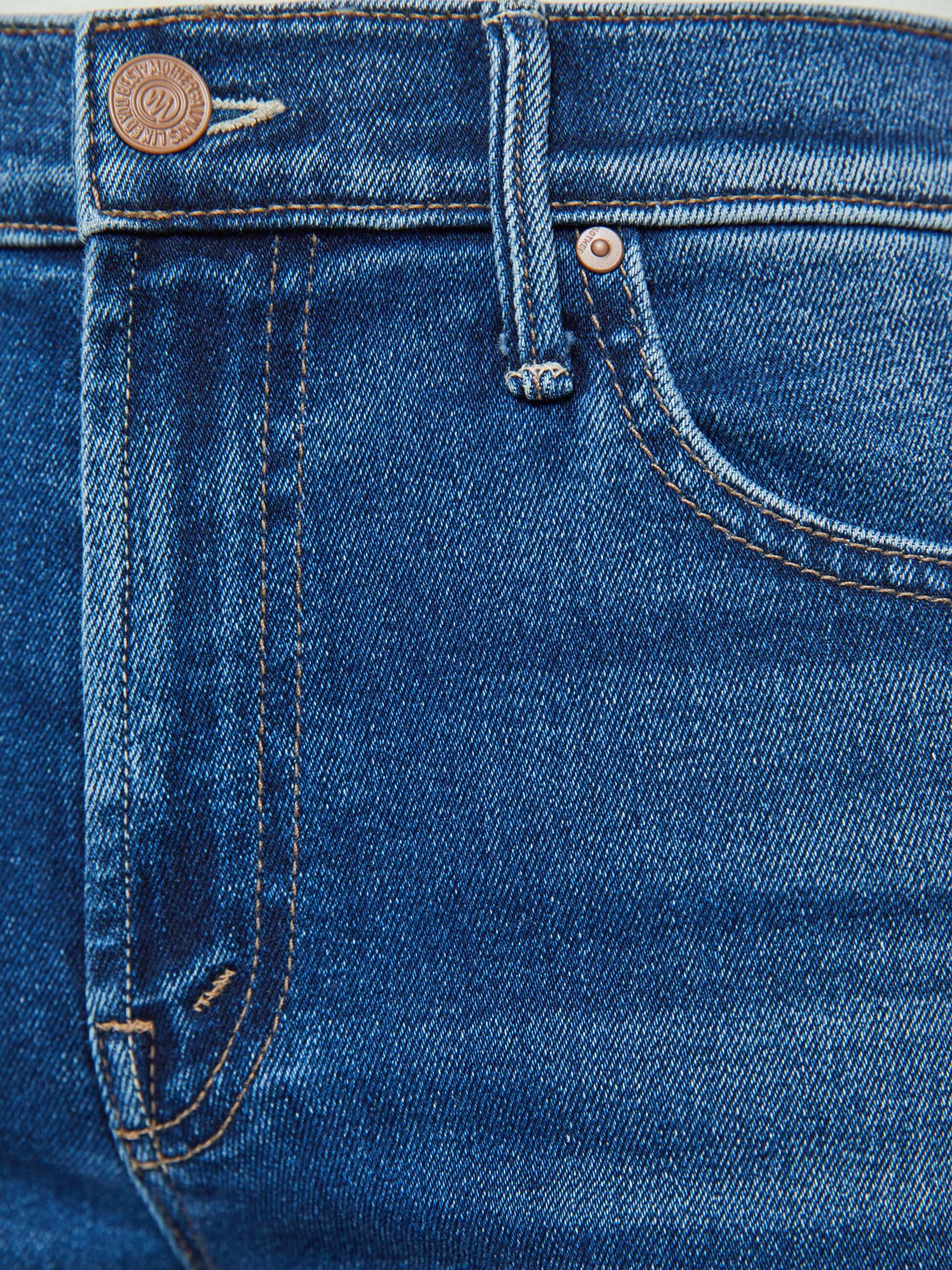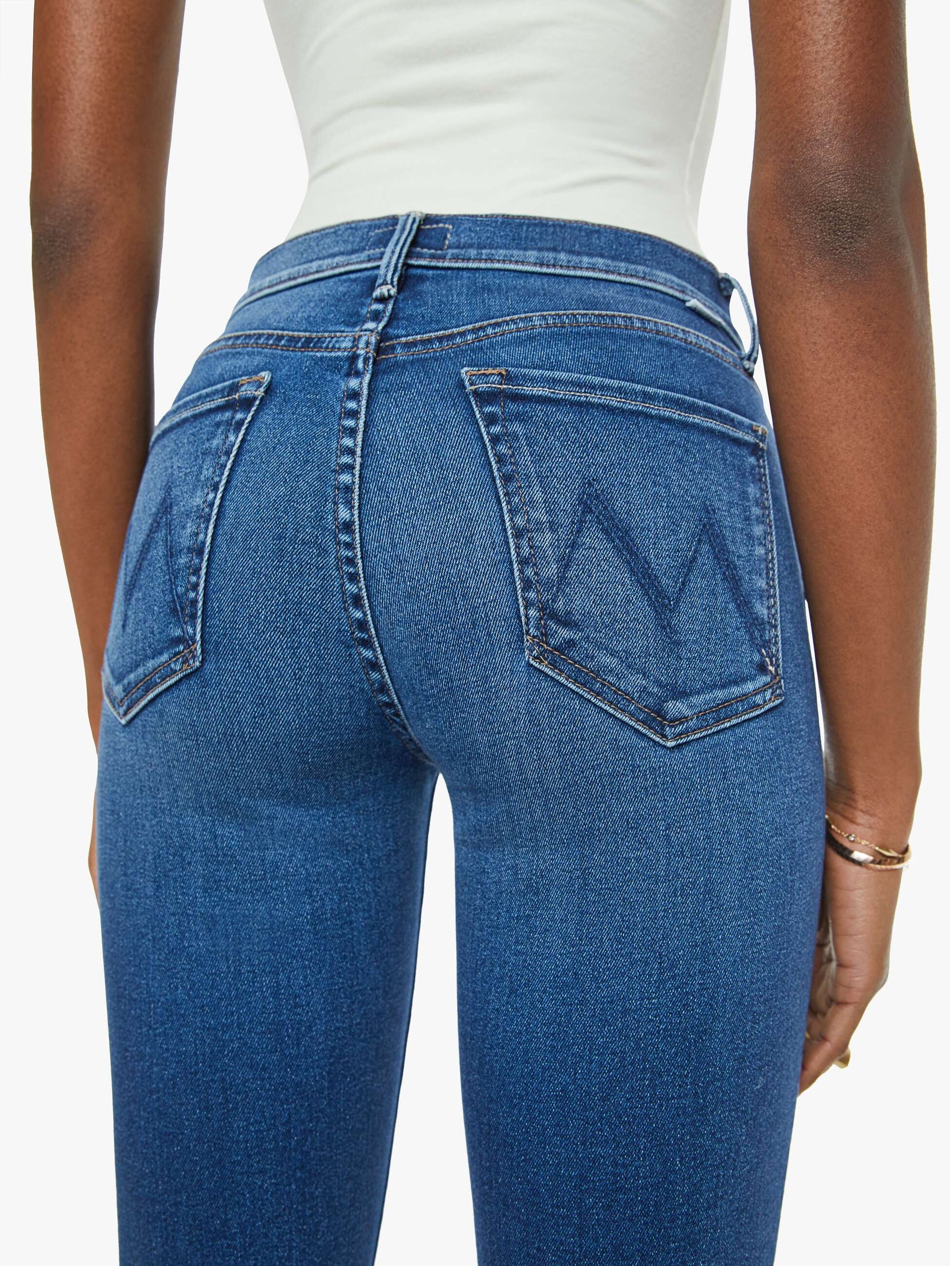 A high-rise bootcut jean featuring an ankle-length inseam and a clean hem. The mid-blue wash has whiskering and fading at the knees for a subtle, lived-in look.