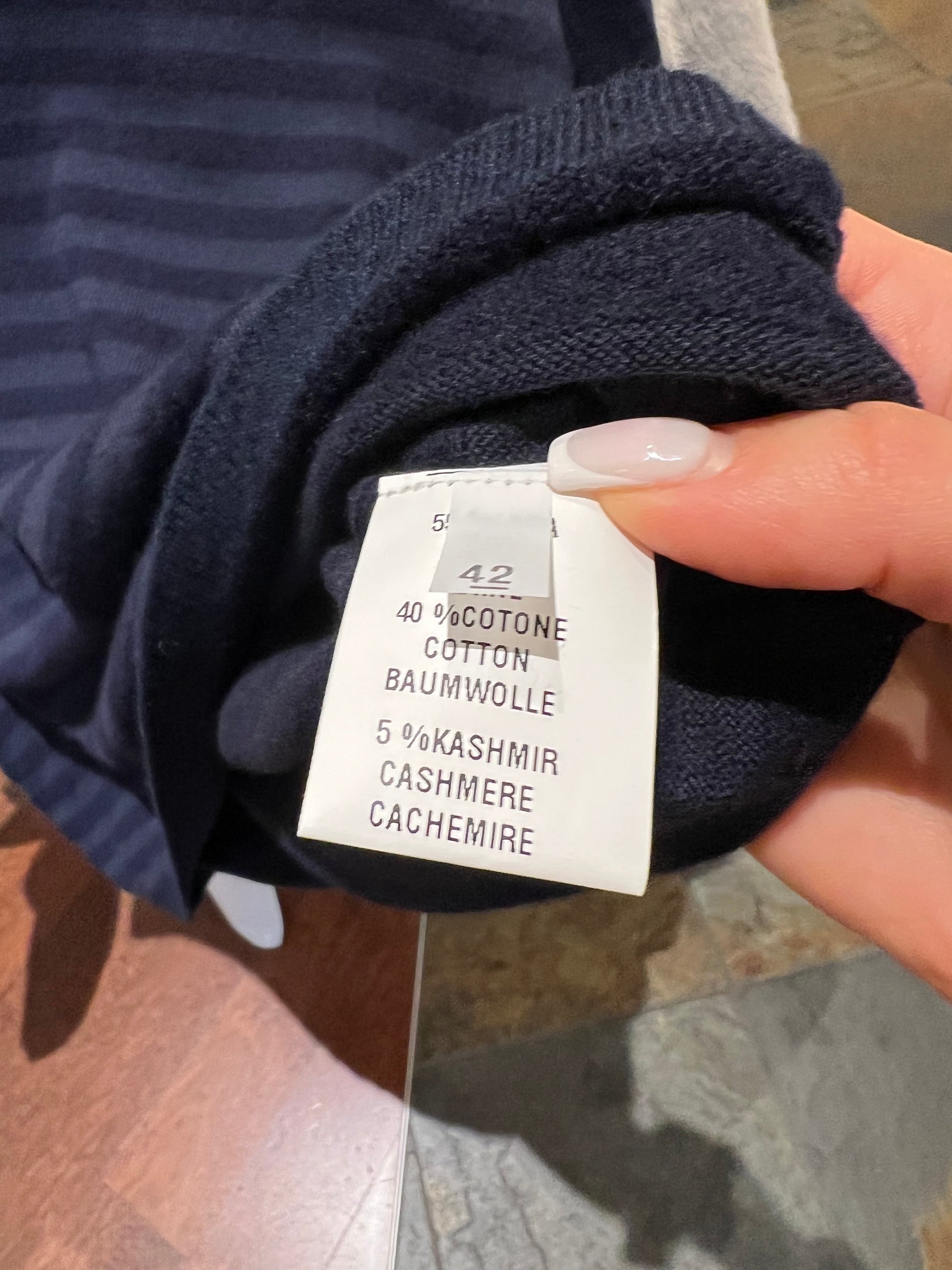 • 40% Cotton, 5% Cashmere (remainder not shown on tag but part of the knit blend)