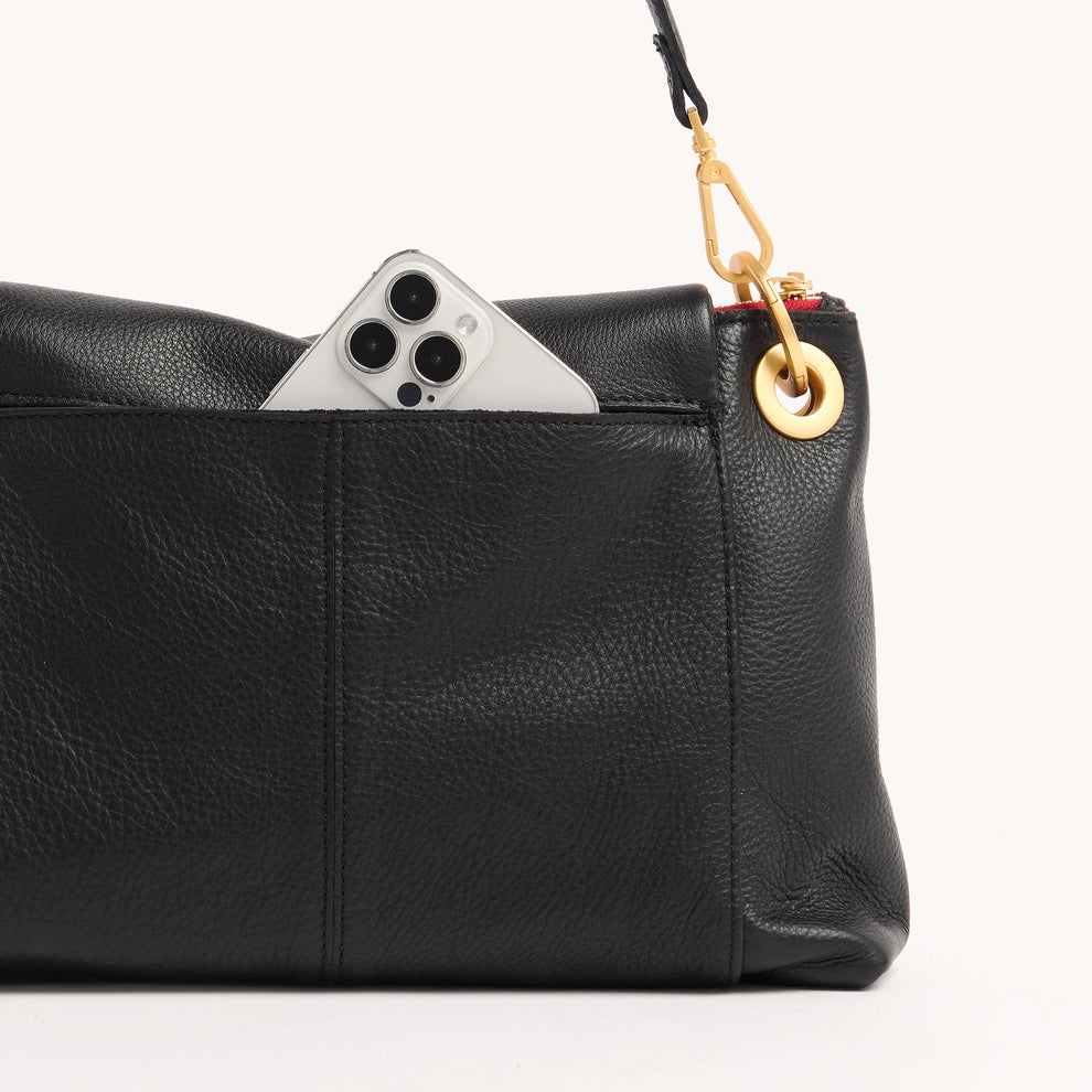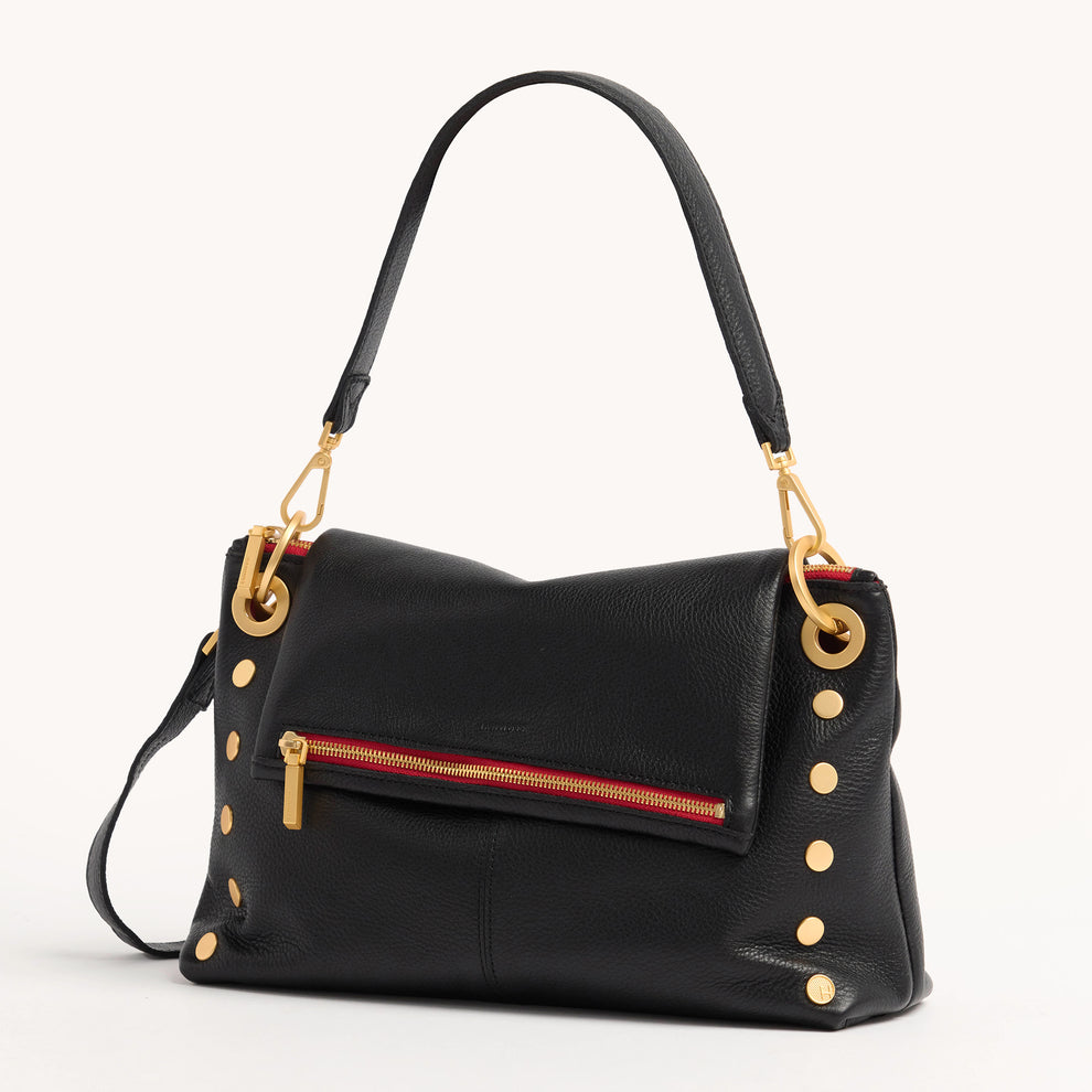 VIP Grande is a new silhouette that combines beloved elements from a few iconic Hammitt styles. Collectors will recognize the signature diagonal flap of Hammitt's best-selling VIP, alongside grommet and O-ring details from the Daniel and accent seams inspired by the Montana. With ample compartments, a key leash and multiple zippered pockets, the VIP Grand offers versatility as a shoulder or crossbody bag. Crafted with Hammitt's classic black pebbled leather, red zipper tape and brushed gold hardware.